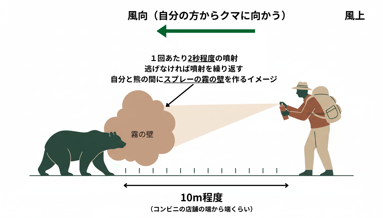 - 噴射の仕方:1〜2秒の噴射を複数回。ひるんだら静かに後退・離脱。