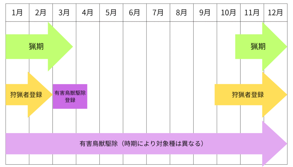 狩猟者登録=猟期の出猟手続き、有害鳥獣駆除=行政の許可捕獲。